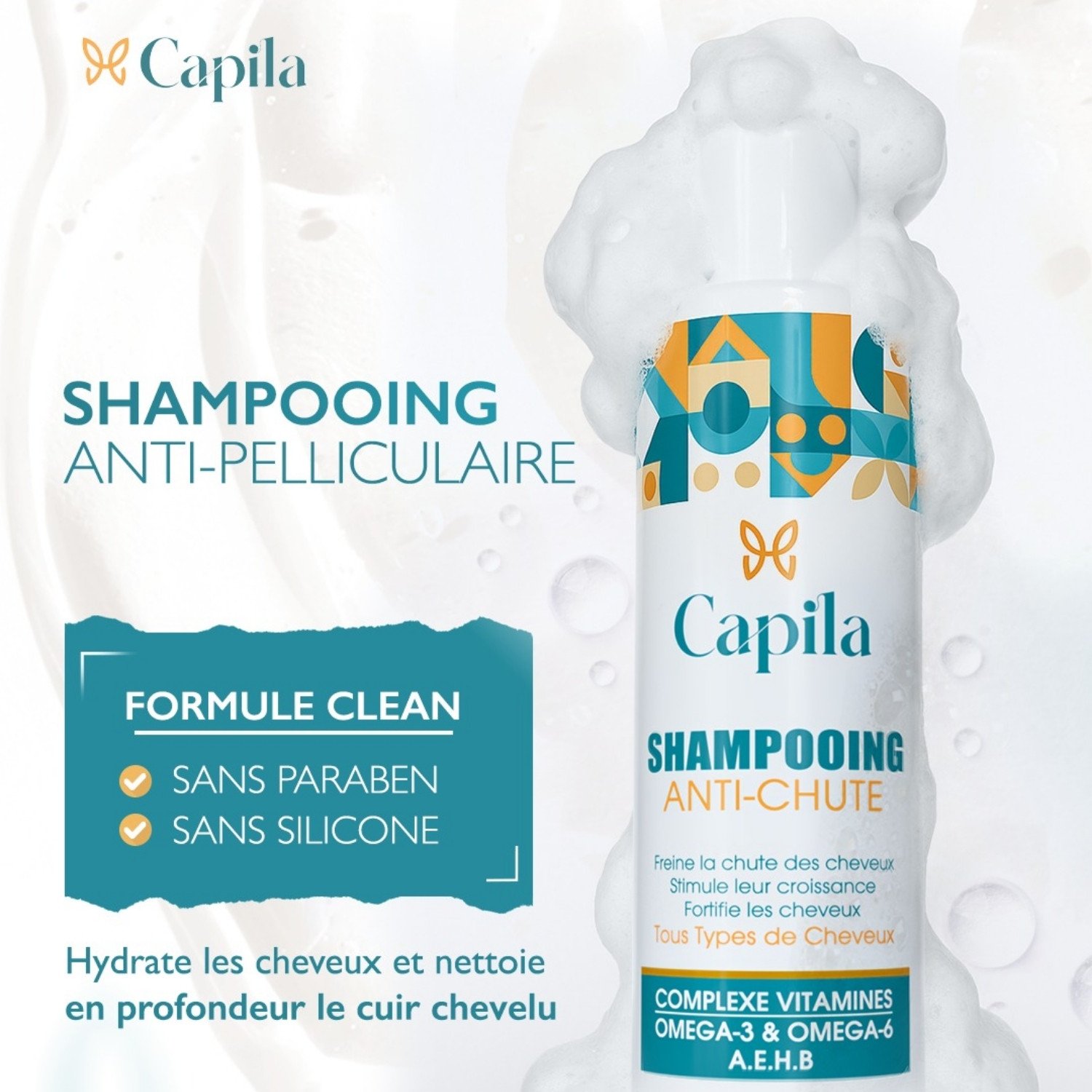 Utiliser le Shampooing Capila adapté (anti-pelliculaire ou anti-chute) sur cheveux mouillés,